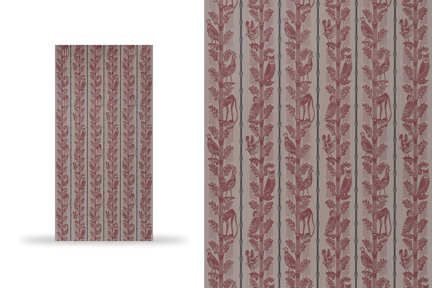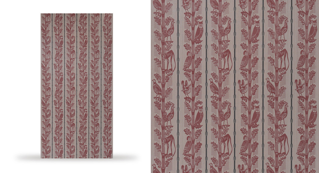 This design exudes storybook charm with a folkloric twist. Stylized trees rise in rhythmic columns, home to a vibrant mix of monkeys, owls, parrots, and pheasants, all in rich, earthy red. With a block print feel, it blends heritage depth with playful vintage vibes. A whimsical forest tapestry, perfect for cozy nooks or eclectic spaces full of wonder.