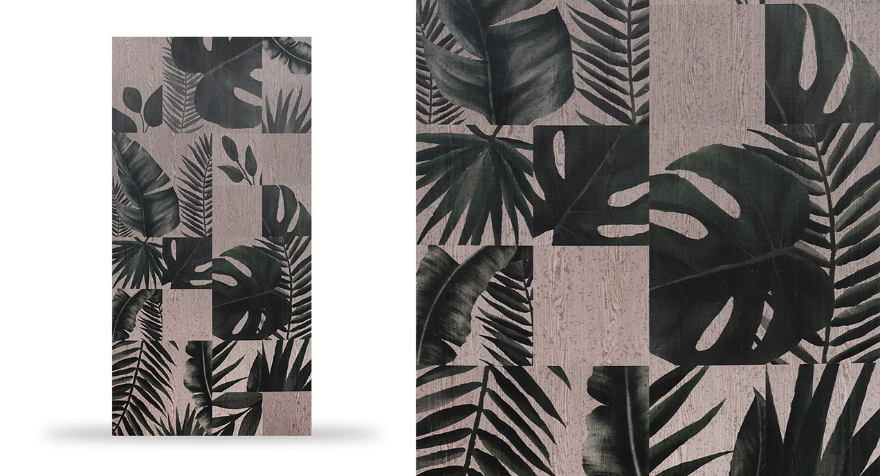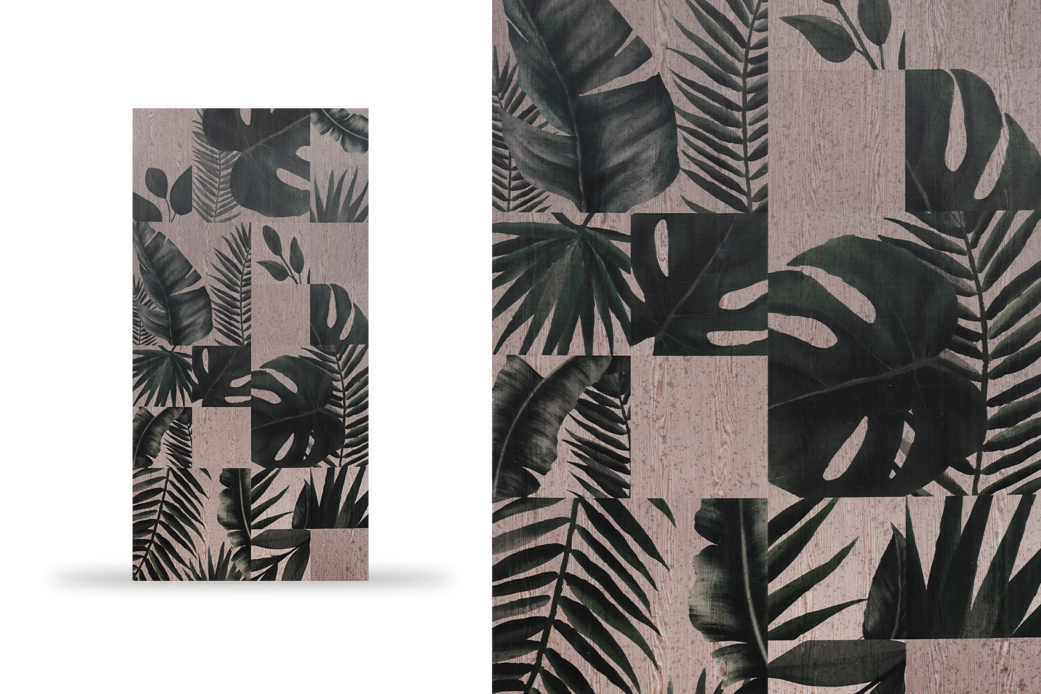 A tropical jungle viewed through a modernist lens, this pattern blends oversized botanical silhouettes with a geometric grid. Deep green leaves like monstera, banana, and fern emerge from rich, shadowed blocks against a neutral woodgrain. Lush and moody, the structured design adds a polished touch.